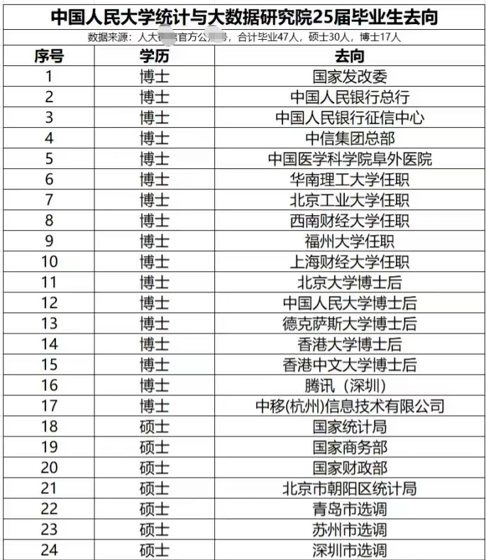 有网友按照该校的公开数据做了了一份中国人民大学统计与大数据研究院25届毕业生的就业走向的图标。我们能看到其就业非常强悍。